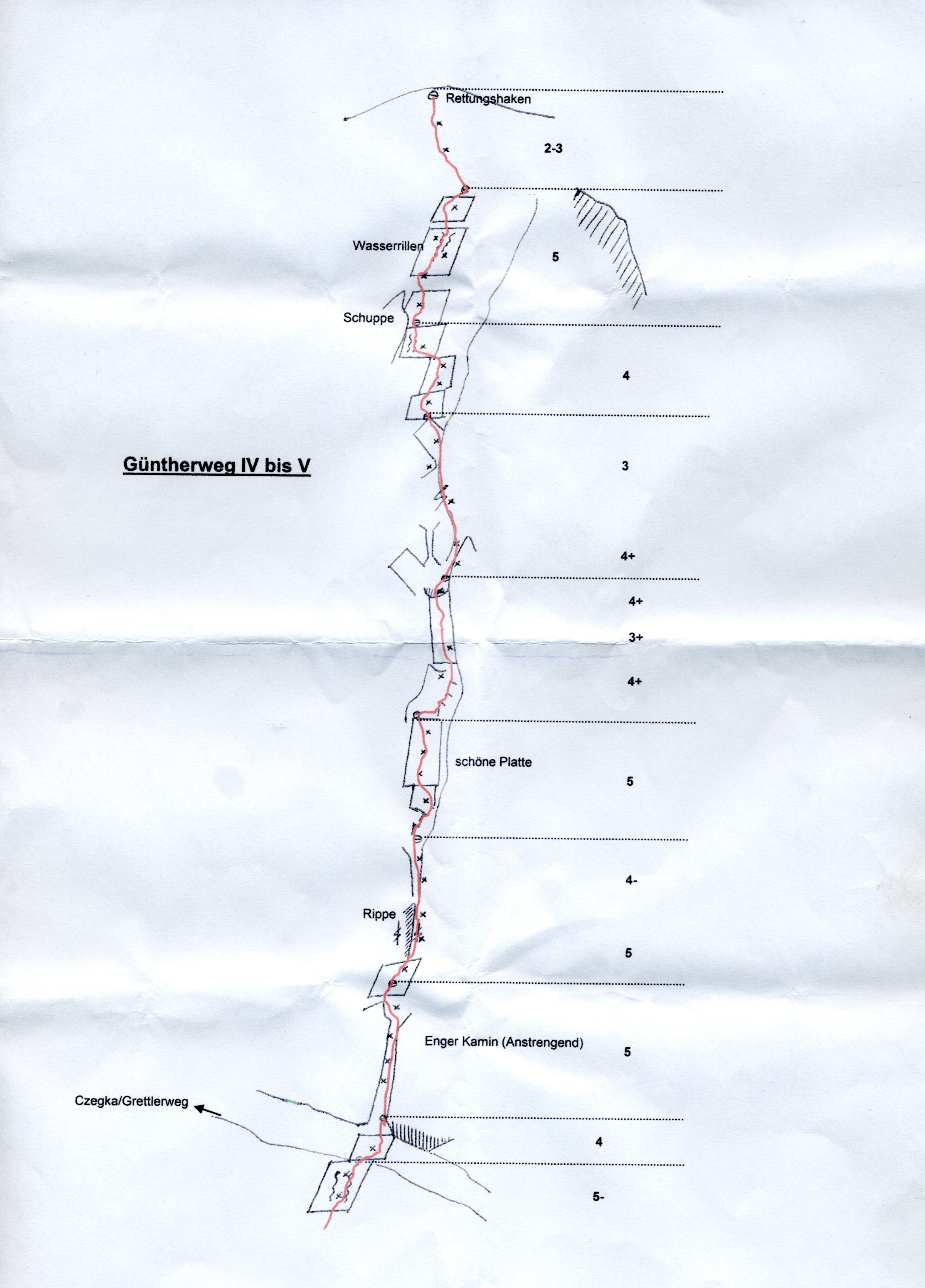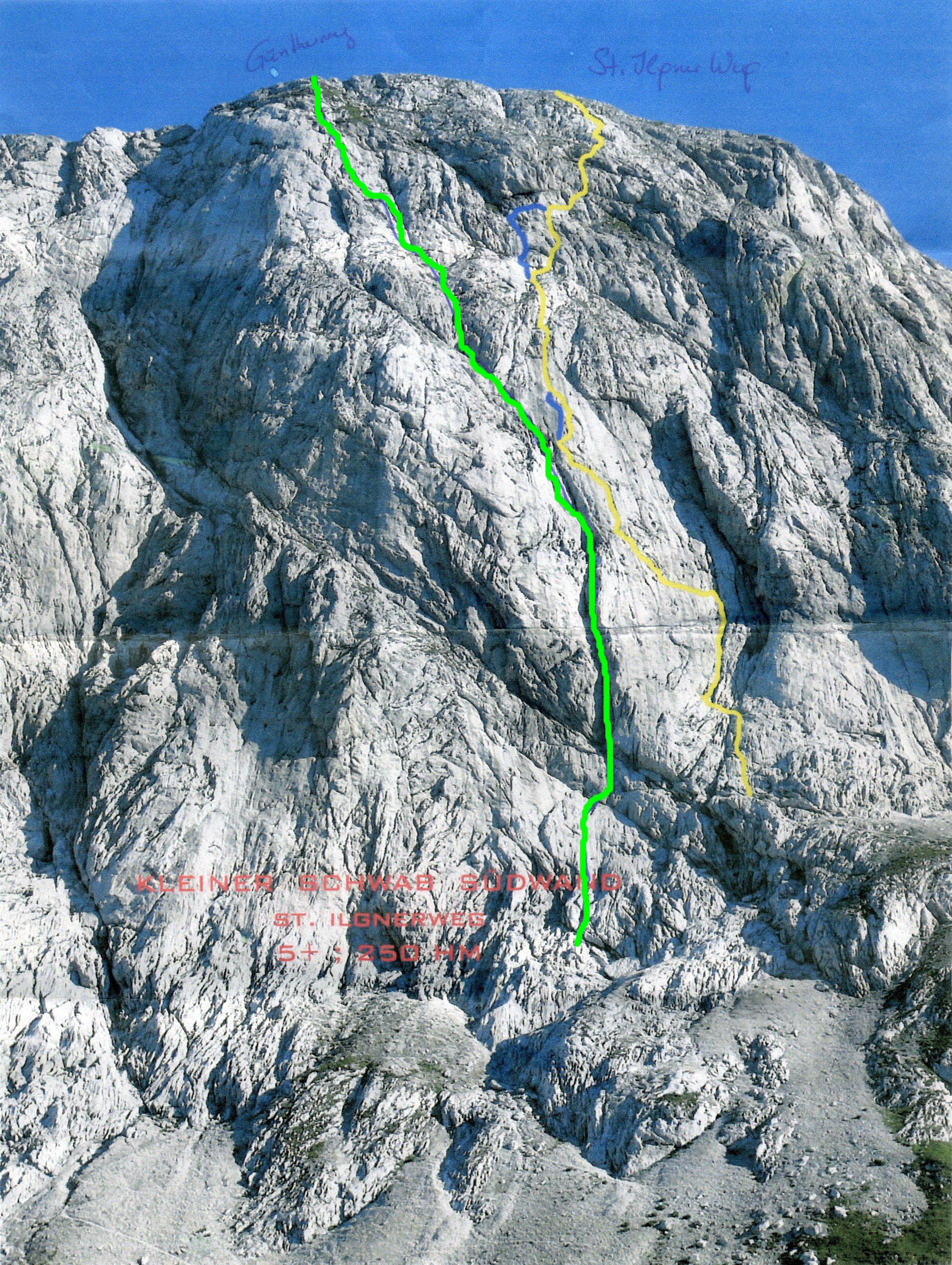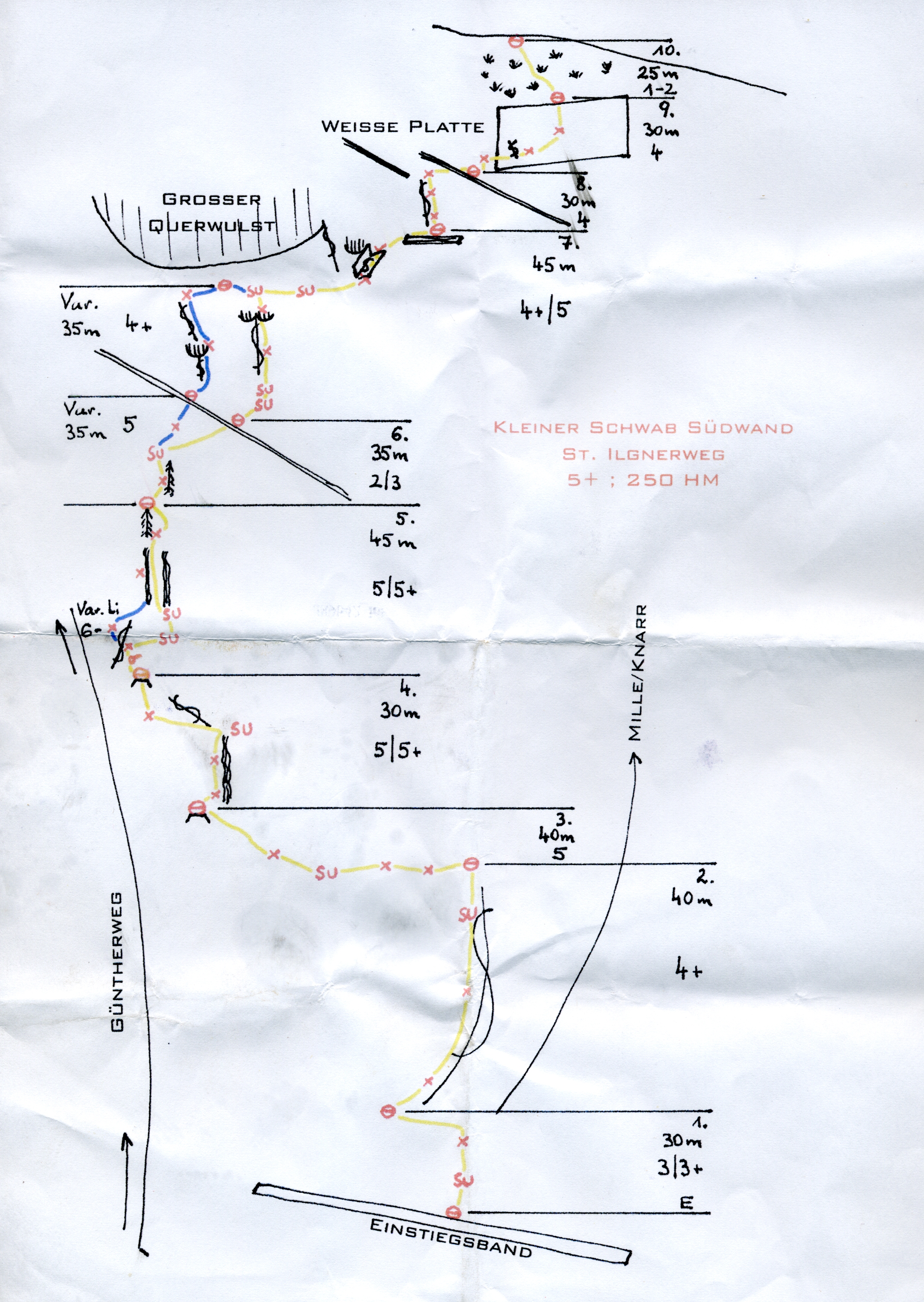 Auf der Voisthaler Hütte bekamen wir noch Informationen, dass an der Karlmauer auch ganz viele Touren saniert wurden und auch in der Südwand des Kleinen Schwab der St. Ilgner und Güntherweg (Topos siehe unten) jetzt eingebohrt und saniert wären. Sicher auch sehr schöne Touren.