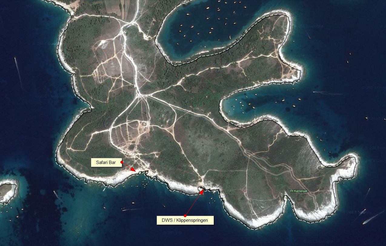 Nach dem Kneipen in Bohinjer See und Soca stand uns der Sinn nach etwas wärmerem Wasser und so ging's ab nach Premantura. Nebenbei erwähnt, die Fahrt entlang der Soca ist landschaftlich wirklich sehr schön. Barbara war vor 20 Jahren schon mal dort und hatte noch irgendwie im Kopf, dass es ein paar Klippen geben muss, wo es sich auch gut vom Wasser aus klettern lassen sollte, zu neudeutsch auch deep water soloing genannt. Es brauchte aber zwei Anläufe, bis wir die richtige Abzweigung erwischt haben. Anfangs waren wir nahe der Safari Bar. Dort gibt's auch ein kleines Höhlchen wo man raus oder rüber klettern kann, der bessere Spot ist aber östlich der Safari Bar. Man nimmt an der großen, südlichsten Kreuzung den linken Weg und nach kurzer Strecke nochmals rechts. So kommt man direkt an den hohen Klippen an. Hier ist es auch viel ruhiger und die Klettermöglichkeiten sind wirklich gut. Es gibt auch eine Höhle, in der man klettern kann. Es gibt auch ein paar eingebohrte Routen, dort wo unten kein Wasser ist. Die Klippen sind hier bis zu 12 Meter hoch. Für uns als DWS Rookies war das eine ganz schöne Überwindung, dann von oben wieder runter zu springen.