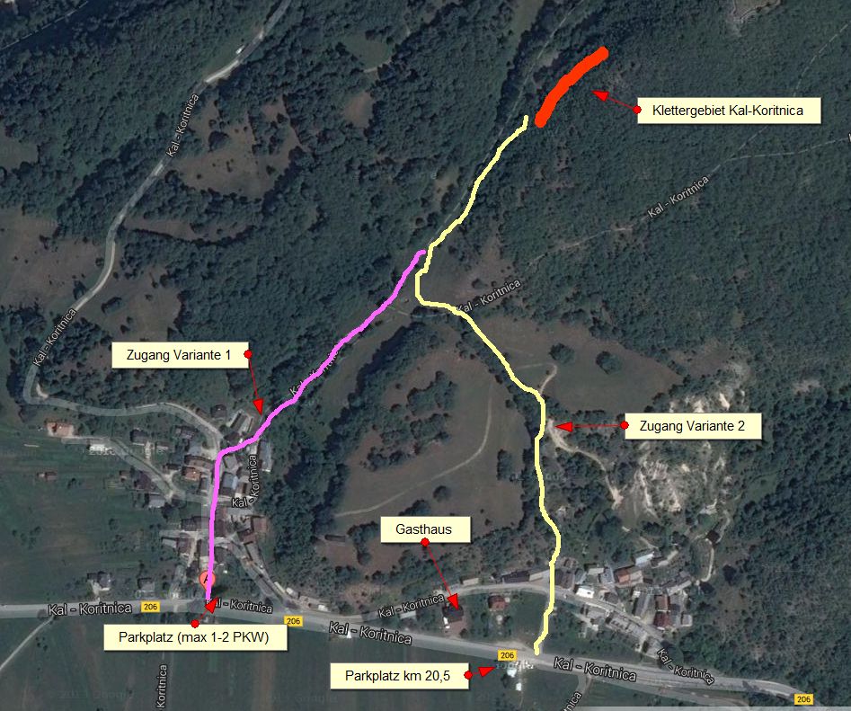 Vom Campinplatz Soca fährt man 5.5 km Talauswärts, bis zur Ortschaft Koritnica. Dort gibt es zwei Möglichkeiten zu parken, für 1 bis 2 PKWs bei der Bushaltestelle, die auch im Führer beschrieben ist, bzw. mehr Platz, für Busse oder Wohnmobile ist bei km 20,5 auf der Südseite der Straße, gegenüber einem Gasthaus. Eine Zustiegsskizze findest Du im Infoteil. Der Klettergarten liegt im Wald und ist im Sommer bis ca. 14 Uhr im Schatten. Es überwiegt griffige Wandkletterei mit den meisten Routen zwischen 3 und 6b und einigen schwierigeren. Am Fuß der Wände ist es meist schön flach, wieder gut für Kinderchen zum Spielen.