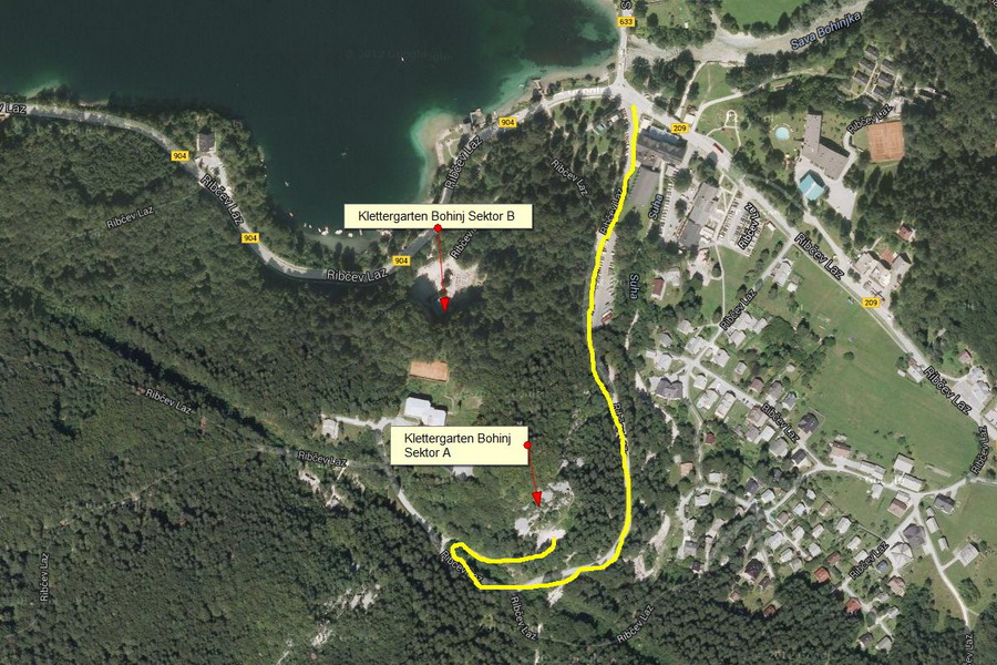 Der Klettergarten Bohinj gliedert sich in zwei Sektoren. Sektor B befindet sich praktisch mitten im Ort, hier gibt es viele Routen, teilw. auch mehr als eine SL, aber großteils etwas schwieriger, so 6b aufwärts. Im rechten Teil gibt's auch einige leichte Sachen, hier ist aber oft die lokale Kletterschule am Werkeln. Dort kann man aber auch vor Ort noch schnell div. Kletterutensilien kaufen, bzw. sich benötigte Informationen holen.
