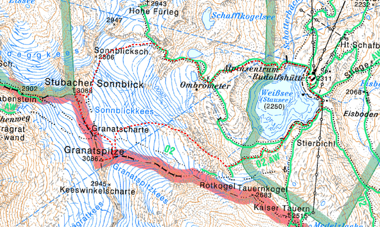 Es war dann doch nicht so einfach eine Tour, die den Auswahlkriterien (die Tour sollte nicht zu schwierig sein, es sollte auch über Gletscher gehen und die An- und Abreise sollte ein Ausmaß nicht überschreiten, welches für ein Wochenende vernünftig ist) entsprach, zu finden. Nach einigem Führerstudium, fiel unsere Wahl auf die Granatspitze und optional noch den Stubacher Sonnblick.