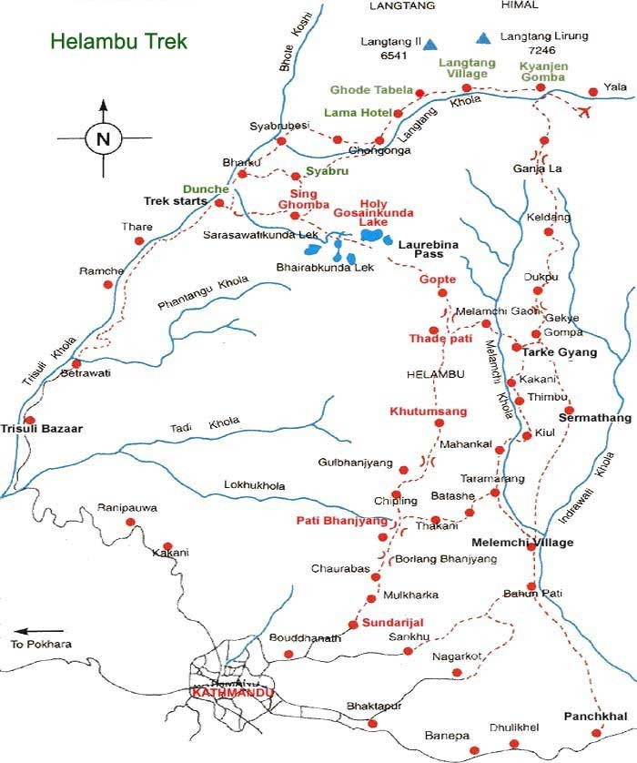 Üblicherweise wird der Gosainkund-Helambu Trek von Dhunche im Trishuli Tal gestartet. Auf der Hin- und Rückreise vom Cho Oyu waren wir dort vorbei gekommen. Von dort geht es zu den Gosainkunda Seen und den etwa 4600 Meter hohen Laurebina Pass nach Tharepati und von dort in weiteren zwei bis drei Tagen nach Sundarijal.