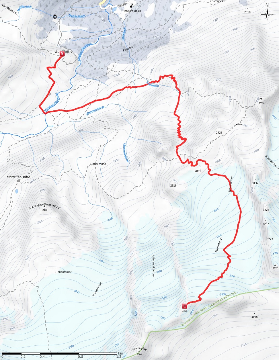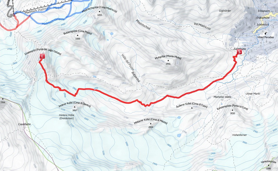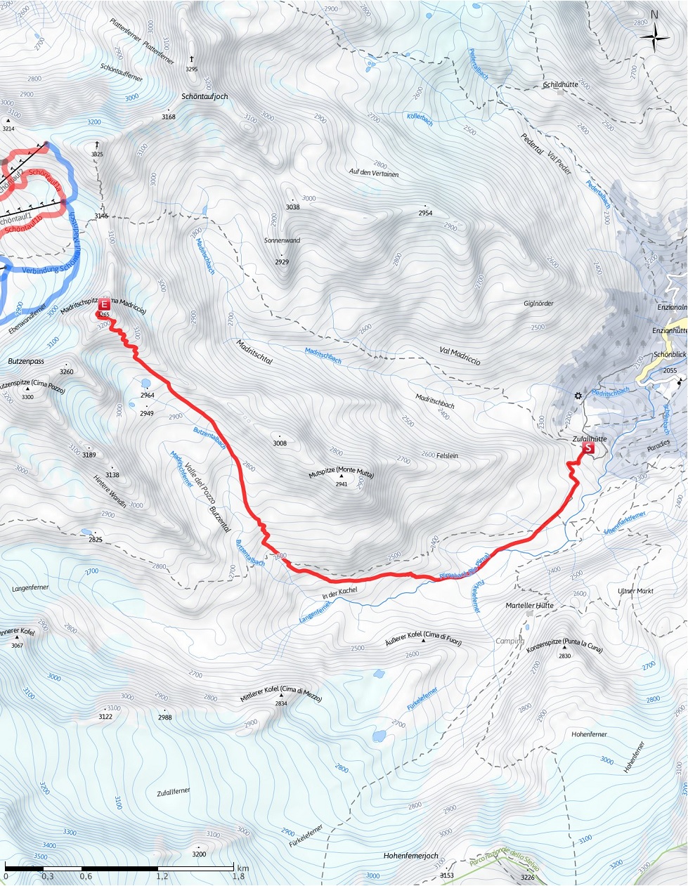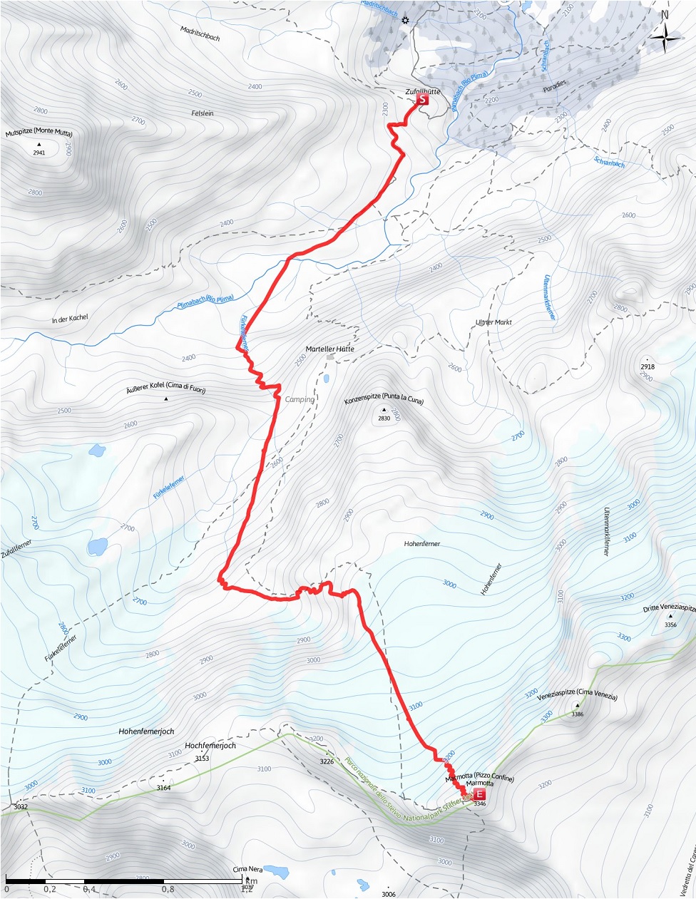 Die ersten paar hundert Meter von der Hütte sind immer gleich, und der kleine Durchschlupf am Ende der Rinne direkt nach der Hütte, wurde von Tag zu Tag zunehmend eisig, und war zuletzt nur noch mit Harscheisen zu überwinden. Insgesamt ist der Weg bei guter Sicht einfach zu finden. Nach dem kurzen Bergabstück, links, Richtung SSO, halten und Richtung Marteller Hütte. Wo es flach wird und links die Hütte zu sehen ist, geht's leicht ansteigend Richtung SSW weiter. Im Talboden verläuft hier der Weg zur Zufallspitze. Wir steigen durch eine breite Rinne aber weiter in östlicher Richtung auf den Hohenferner zu. Ist dieser erreicht, geht's recht flach direkt Richtung Cima Marmotta. Das letzte Stück vor dem Skidepot ist nochmals etwas steiler und die letzten 30 Höhenmeter geht's zu Fuß.
