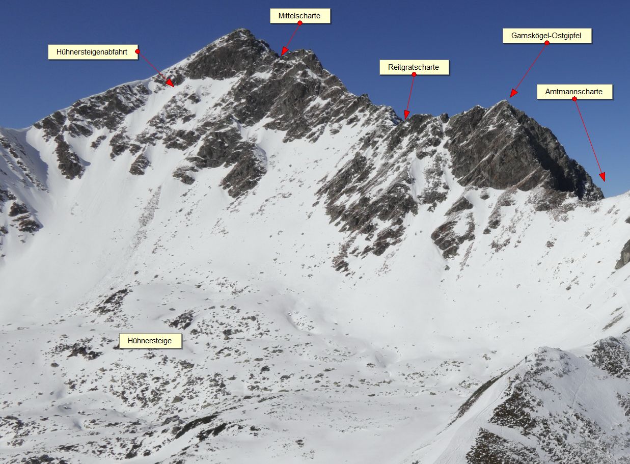 Übersicht Gamskögel/Gamskögelgrat Südseite/Hühnersteige (Quelle: www.lawine-steiermark.at) |