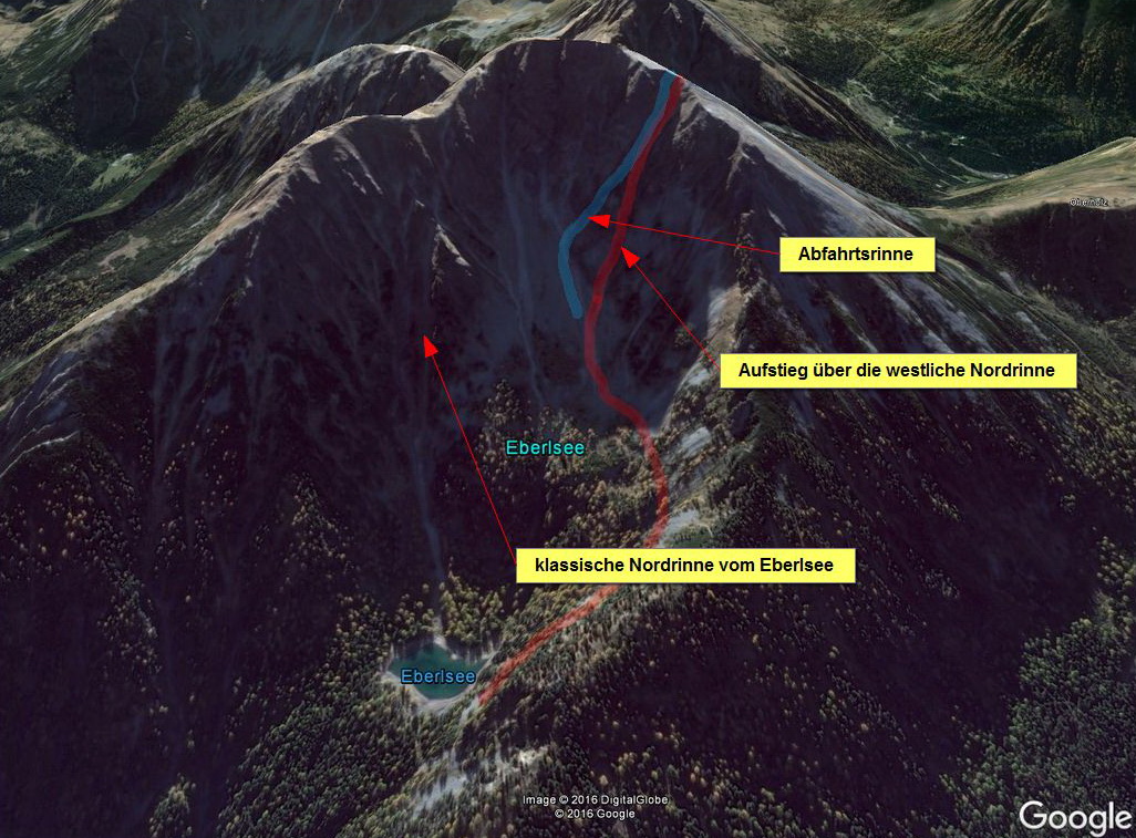, Peter mit Markus RafflingDie Nordseite des Großen Grießstein ist ein eher selten besuchtes Tourengebiet, bietet aber den einen oder anderen skialpinistisch interessanten Anstieg. Die klassische Nordwandrinne, in der östlichen Nordflanke, die direkt vom Eberlsee startet stieg ich mir Barbara vor einigen Jahren mal hoch. Markus hatte im Spätherbst die Rinne, die in weiterer Folge unsere Abfahrtsrinne werden sollte, angeschaut. Und wie es der Zufall so wollte, haben wir für den Aufstieg noch eine andere erwischt, da alles aus der Nähe betrachtet, immer mal anders aussieht.