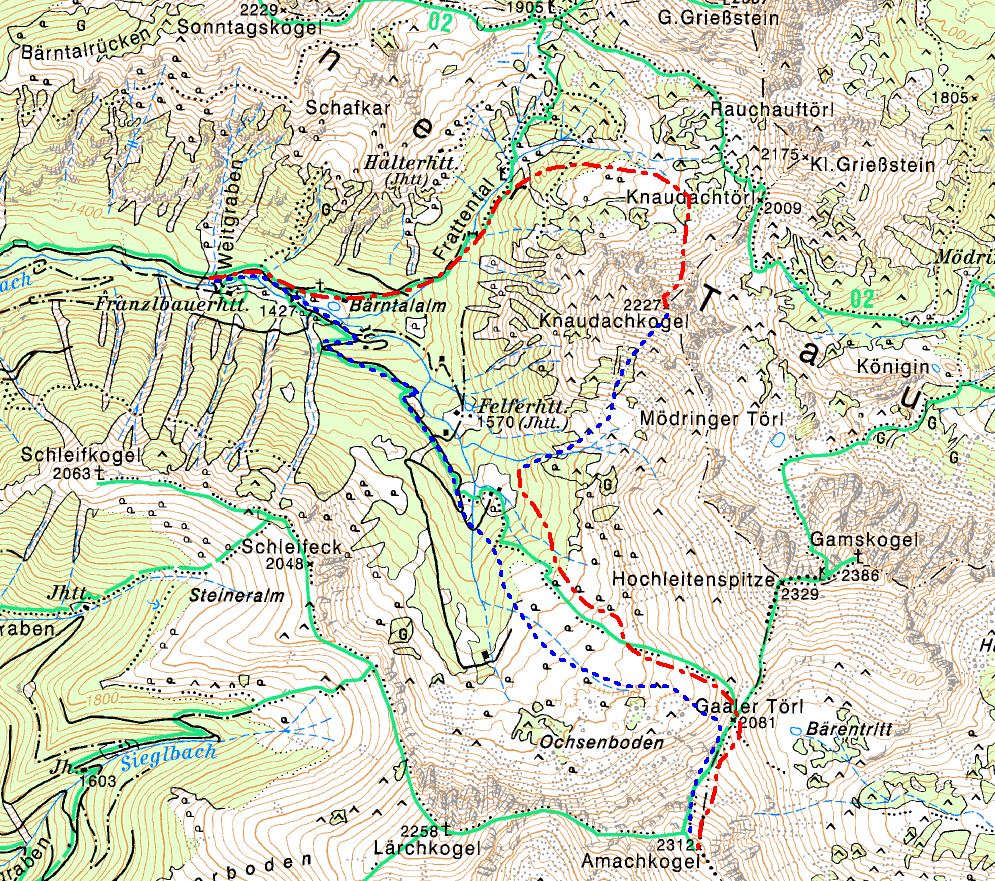 , PeterMotiviert durch die gute Schneelage im Bären/Frattental zog es mich nach der SW-Rinne des Großen Griessteins und der Lärchkogel Nordrinne, gleich wieder in die Gegend. Diesmal wollte ich mir die Nordseite des Knaudachkogel anschauen. Vom großen Griesstein aus, war mir eine Rinne aufgefallen, die diagonal durch die Nordflanke verläuft. Diese 'Diagonalrinne' sollte das Ziel des Tages sein.