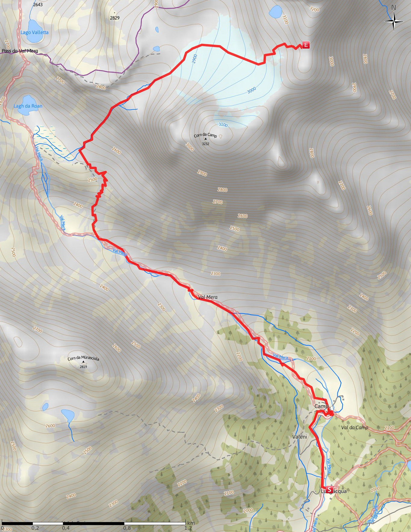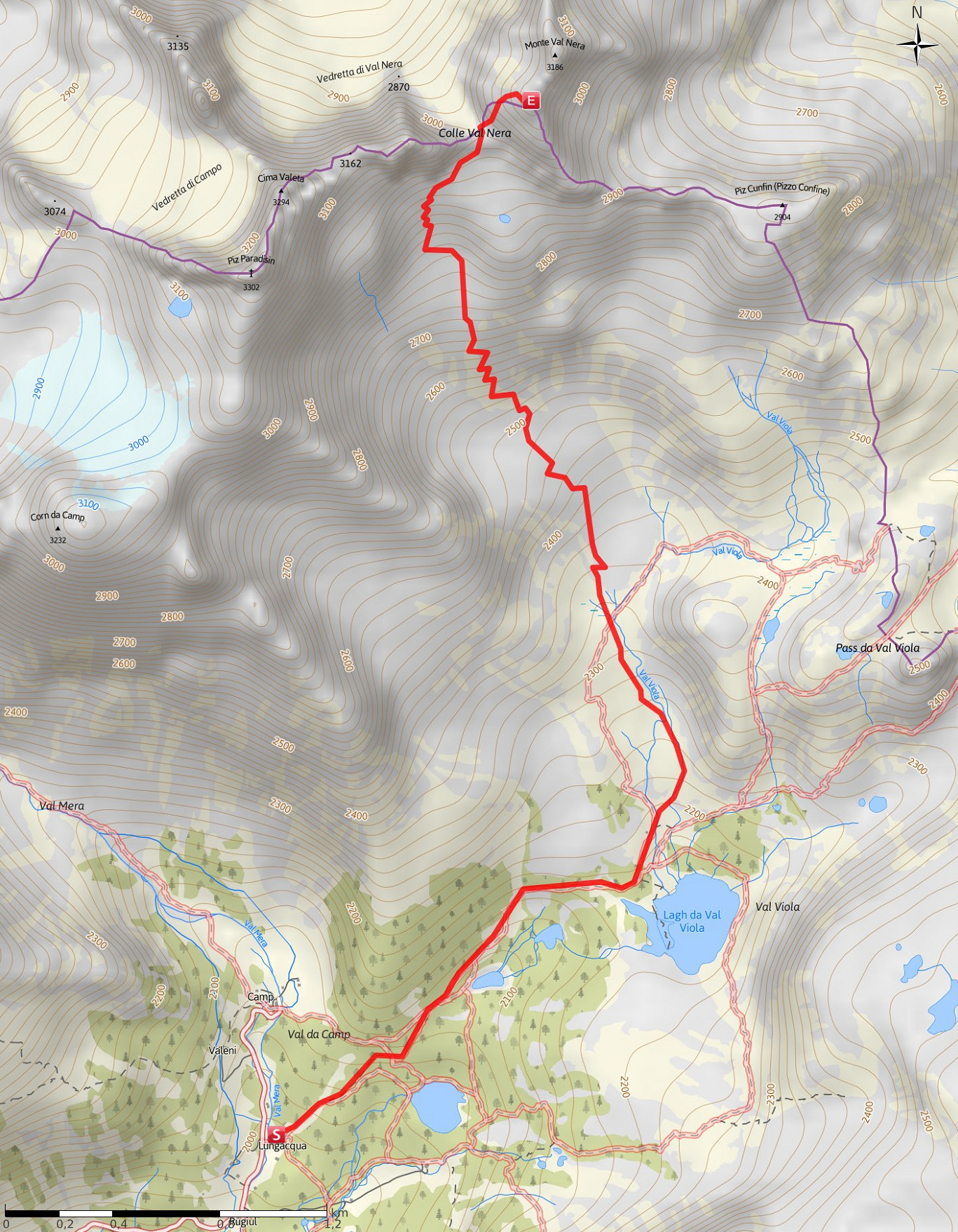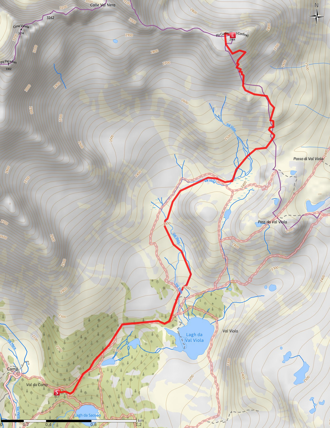 Unser nächstes Ziel sollte der Piz Val Nera sein. Dafür ging es nicht wie am Vortag ins Val Mera, sondern zuerst durch den Wald in Richtung Lagh da Viola. Wo sich der Wald lichtet, geht's durch ein kleines Tälchen ansteigend in einem Linksbogen auf das lt. Karte sog. 'Campasciol'. Eine tolle alpine Landschaft breitete sich hier vor uns aus. Zur Linken Corn da Camp, La Pala und Piz Paradisin von der nun anderen Seite, vor uns der Piz Val Nera. Und rechts hinter uns die Cornos di Dosde sowie hinter uns die Scima da Saoseo. Landschaftlich ist es hier fast noch eindrücklicher als am Vortag im Val Mera.