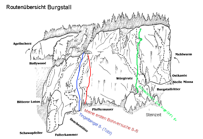 Gleich von Beginn geht es steil aber gut griffig los. Der Hinweis am Topo mit dem Loch nach dem dritten Haken ist recht hilfreich, und beruhigt beim Blick in die steile Wand. Die ersten zwei Drittel der ersten Länge sind wirklich steil, danach legt es sich eine Spur zurück. Wir empfanden den Fels als durchwegs fest; vor allem wenn man schon mal am Burgstall war, vertraut man dem Ganzen etwas mehr.