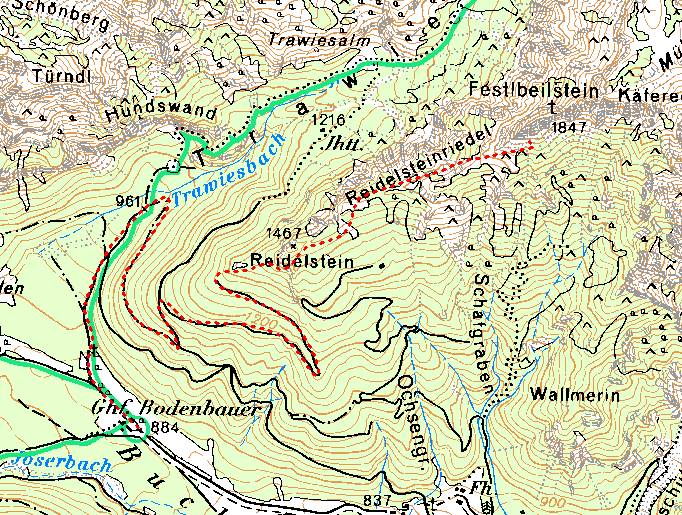 Vom Gasthof Bodenbauer wie in der Skizze im Infoteil dargestellt. Am Ende der Forststraße beginnt ein schmaler Steig. Unter dem Reidelsteinriedl teilweise etwas verwachsen aber mit Steinmännern und roten Schleifchen markiert.