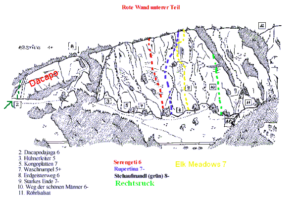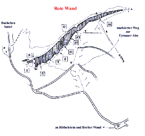 Übersicht Routen Rote Wand unterer Teil |