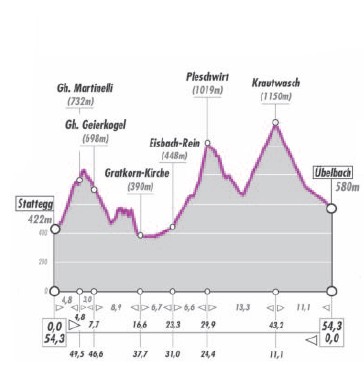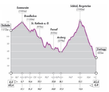 Es war abzusehen, dass die Tour mindestens 12 Stunden dauern würde, deshalb war frühes Aufstehen gefragt; um 05:30 begann ich in Stattegg, in die Pedale zu treten. Nun galt es in den ersten Stunden die Kräfte zu schonen, 140 Pulsschläge pro Minute wollte ich nicht überschreiten; bei diesem Limit hatte ich das Gefühl, über viele Stunden leistungsfähig zu bleiben. Rannach, Rein (öffentlicher Wasserpender direkt an der Alpentourstrecke (gegenüber Seniorenheim)), Plesch, Krautwasch, Übelbach, die erste Tagesetappe war nach 4 Stunden 15 min hinter mich gebracht. Soweit, bis auf diverse Sitz und Nackenschmerzen, war noch alles im grünen Bereich.
