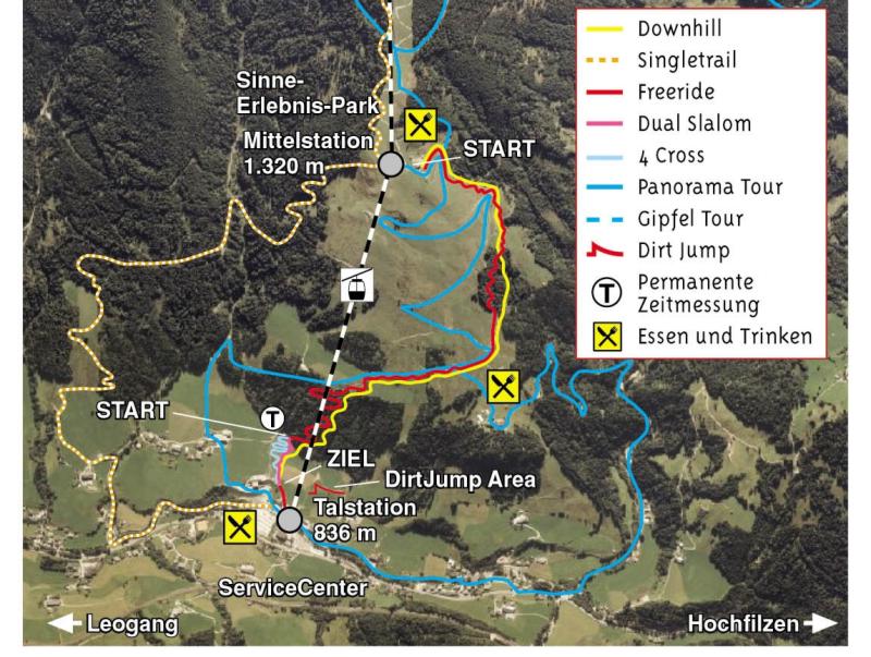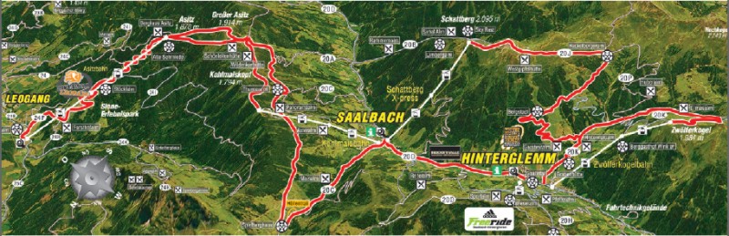 5000 Höhenmeter Abfahrt, Auffahrt mit der Gondelbahn, das klingt nett und eigentlich gar nicht so anstrengend. Erstmals begannen wir etwas zu überlegen, als der Angestellte im Bikeshop in Leogang meinte, man würde gute sechs Stunden für die Tour brauchen. Im Nachhinein betrachtet muss man die Reifen schon ganz schön glühen lassen, vor allem, wenn die Tour unbekannt ist und man, so wie wir, ein paar knackige Varianten [und Brezen (Verbandszeug sollte immer im Bikerucksack sein ;-)] einbaut. Auch sollte man sich doch darauf einstellen, nicht nur bergab zu fahren, die Tour bietet ein paar wirklich knackige Steigungen und anspruchsvolle wurzelgespickte Singeltrails. Insgesamt dürften so ca. 600 Höhenmeter auch bergauf zu überwinden sein. Und auch fast 5000 Höhenmeter Abfahrt belasten die Muskulatur ganz schön, das Bier schmeckt auf alle Fälle nach der Tour!