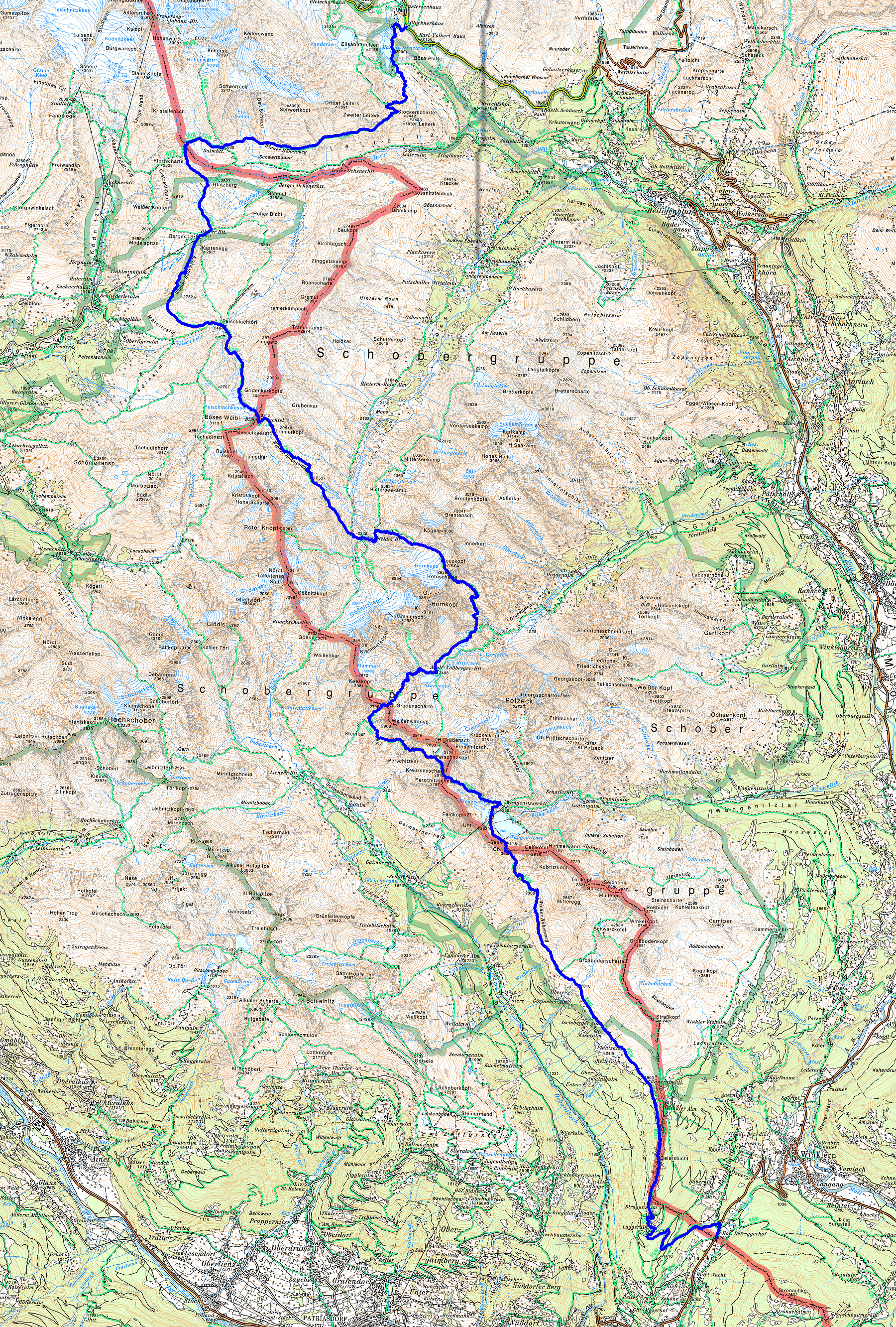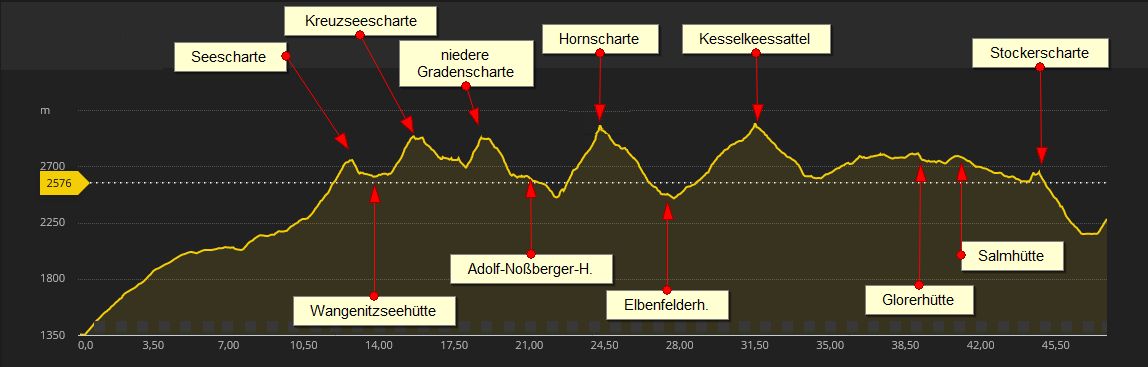 Wie erwähnt wurde dann der Kreuzecktrail am 25ten August abgesagt. Zum Glück hatte ich schon einen anderen, privaten, Trailrunning Plan im Kopf. Ich wollte versuchen, den Wiener Höhenweg, eine Hochgebirgs-Etappenwanderung die normalerweise in fünf bis sechs Tagesetappen begangen wird, an einem Tag zu bewältigen. Vom Iselsberg nahe Lienz, durch die Schobergruppe bis zum Glocknerhaus an der Großglockner Hochalpenstraße. Es warten rund 48 Kilometer und 4000 Höhenmeter Aufstieg in (hoch)alpinem Gelände auf den ambitionierten Trailrunner. Die durchschnittliche Höhenlage liegt bei 2500 Metern und man hat zwei Übergänge mit über 2900 Metern zu bewältigen.