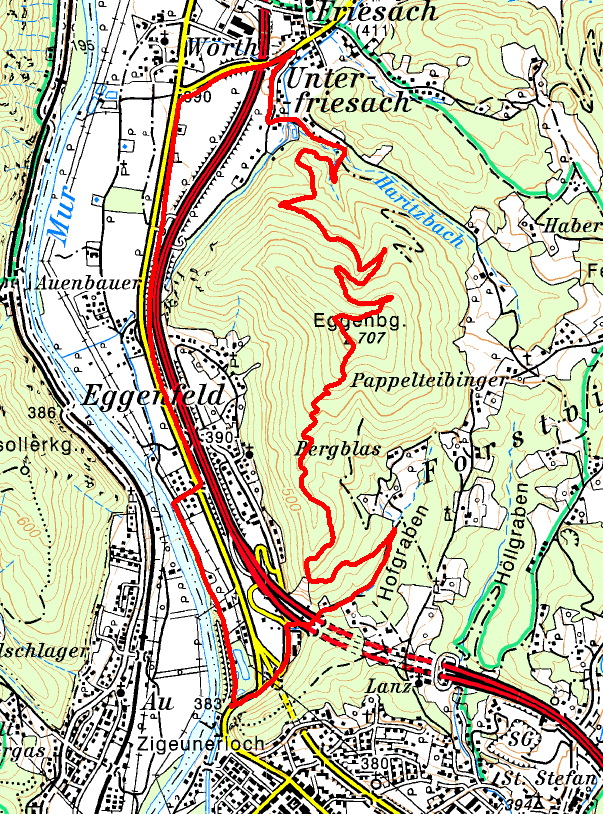 , PeterDie Runde auf den Eggenberg ist eine unschwierige Laufrunde, die aber über weite Teile auf Waldwegen verläuft. Auf den Gipfel des Eggenbergs, Wegweiser, gibt's aber einen steilen Trail. Zurück von Friesach geht's dann über den Radweg oder entlang der Mur.