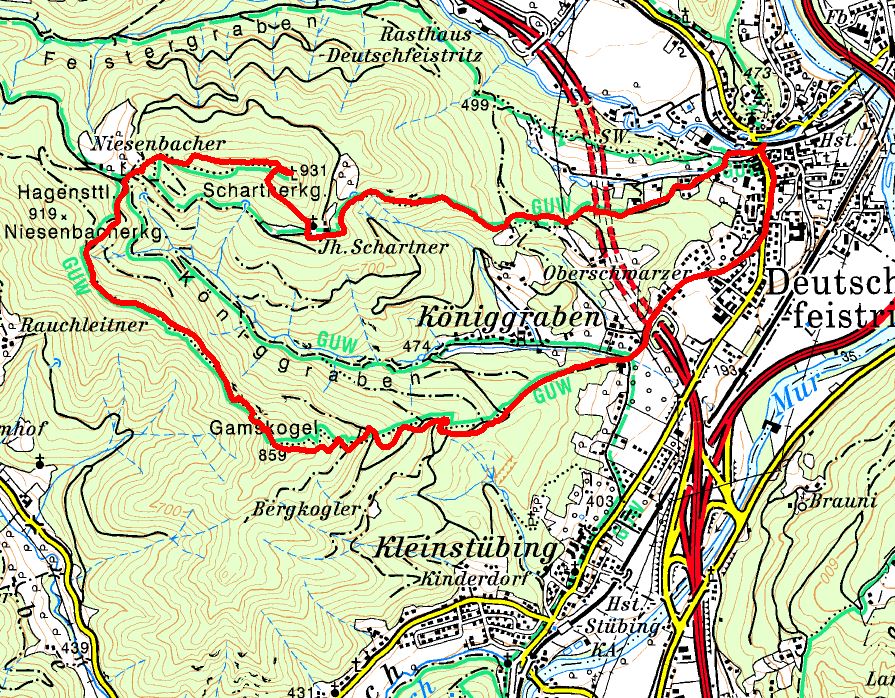 Ausgangspunkt dieser Tour ist der Parkplatz direkt im Zentrum von Deutschfeistritz, hier gibt es öffentliche Parkplätze. Man folgt zuerst einige hundert Meter der Hauptsraße Richtung süden (Stübing) bis man rechts auf eine Seitenstraße mit dem Wegweiser 'Königgraben' abbiegt. Bis zum Einstieg in den Trail auf den Gamskogel hat man so 1,5 flache Kilometer zum warm laufen. Beim Bauernhof an der Abzweigung in den Königgraben beginnt der Trail auf den Gamskogel. Bis zum Gipfel des Gamskogels sind schon mal 450 Höhenmeter auf 2,3 km Strecke zurückzulegen.