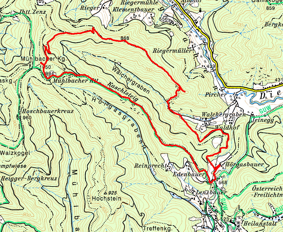 Nun dem Forstweg folgen, bis man links auf einen Wiesenweg zum Hörgasbauer abbiegen kann und zum Ausgangspunkt zurück gelangt.