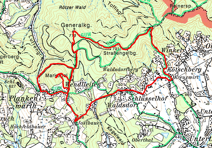 , PeterAusganspunkt für diese Laufstrecke ist der oberste Parkplatz im Luttengraben, wo gegenüber eine Forststraße abzweigt. Über diese Forststraße startet der Lauf. Nach knapp 1 km bei der großen Forstweg-Kreuzung nun rechts bergauf, vorbei beim Hasengehege bis zu Kapelle und dort den Weg links runter bis zum Jostbauer. Nun wieder scharf links bergab Richtung Waldsdorf/Schlüsselhof. Auf der Asphaltstraße zum Kreuzwirt. Nun den Wanderweg bis zu Bilderbuche, teilweise ziemlich steil.