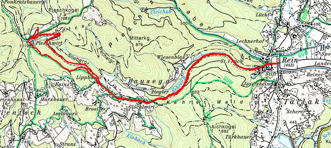 Ausgangspunkt ist der Parkplatz beim Stift Rein. Nun entweder über die Alpentour (Forstweg) bzw. über die Straße, einfacher - da homogenerer Anstieg nach Kehr. Von Kehr auf der Alpentour über schönen Wanderweg zum Pleschwirt. Nun ein Stück auf dem Schotterweg Richtung Mühlbachhütte und dann direkt auf den Hügel zum 'Gipfelkreuz'. Für den Rückweg kann man die Straße bzw. den Aufstiegsweg nehmen.