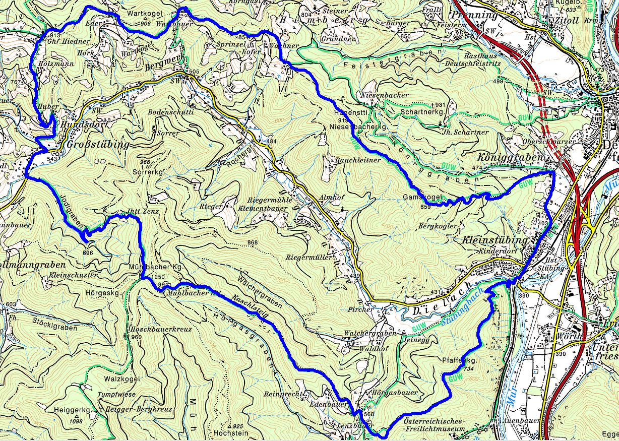 Wie gesagt, erstmal zwei Kilometer zum Warmlaufen, dann geht es eigentlich gleich richtig zur Sache, dem Wanderweg auf den Pfaffenkogel folgend, legt man gleich mal 240 Höhenmeter auf einer Strecke von 800 Metern zurück! Anschließend geht es im Auf und Ab Richtung Lenzbauer. Ein paar Mal ist der Weg nicht ganz gut markiert, es macht Sinn den GPS Track dabei zu haben. Nach der Überschreitung des Pfaffenkogels erreicht man das Gehöft Lenzbauer. Alternativ kann man von Kleinstübing, entlang des Stübingbaches am GU Wanderweg 'gemütlicher' zum Lenzbauer laufen.