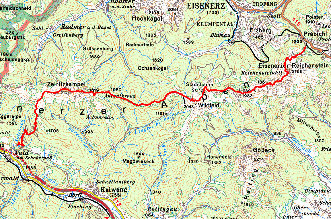 Aufs Zeiritzkampl geht's jetzt nochmal 500 Hm am Stück bergauf; und zuletzt über den schmalen Gipfelgrat zum Gipfel. Blickt man von hier zurück zum Stadelstein und Eisenerzer Reichenstein ist das schon ein ganz schönes Stück, das man bislang in den Beinen hat. Nun geht's in den Sattel zwischen Zeiritzkampl und Hinkareck. Da mein Ziel ja Wald am Schoberpass war, folgte ich dem Wanderweg östlich des Gipfels Richtung Enzianboden. Für Aspiranten auf die gesamte Überschreitung der Eisenerzer Alpen geht's von hier an weiter Richtung Speikkogel, Lahnerleitenspitze ...